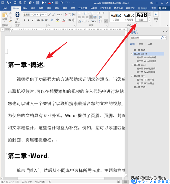 通过上述几步,文档正文框架基本就定型了。接着设置各个级别标题的样式。可以开启【导航窗格】,直观查看文档中各个级别标题的存在。
