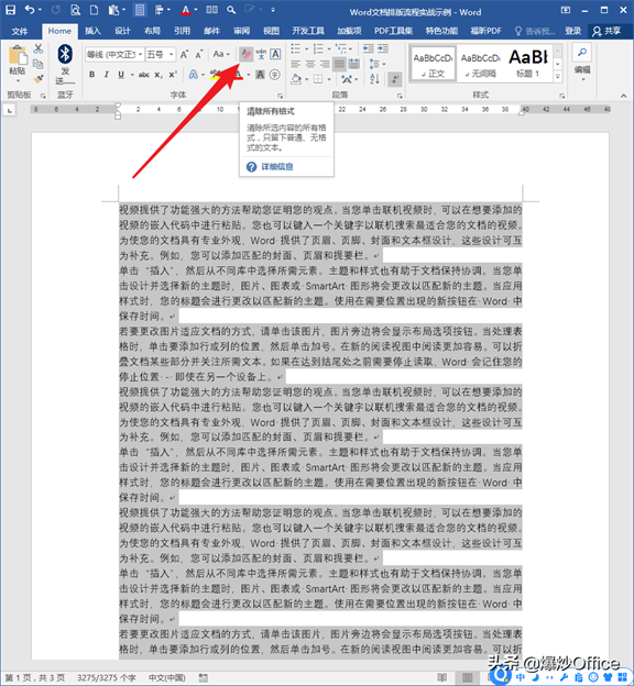拿到文档后,可以先全文浏览一下,整体掌握存在的问题。如果手上文档中存在各种稀奇古怪的样式,比如字体、字号、字色等,不妨选中全文,执行【清除所有格式】。