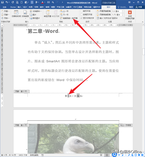 回到正文部分的页码,取消掉【链接到前一条页眉】,并把页码序号设置为从1开始。