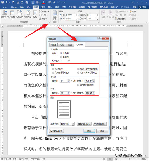 正文字号确定后,另一个影响页面数量的就是文档网格了。每行的字数控制文字之间的间距,每页行数控制行间距。可以开启显示网格线,方便查看网格设置效果。