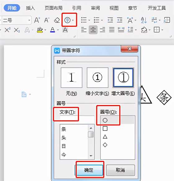 操作方法:将光标定位在文档中,点击“开始”——“字体”——“带圈字符”,输入文字,选择圈号,然后点击确定即可。