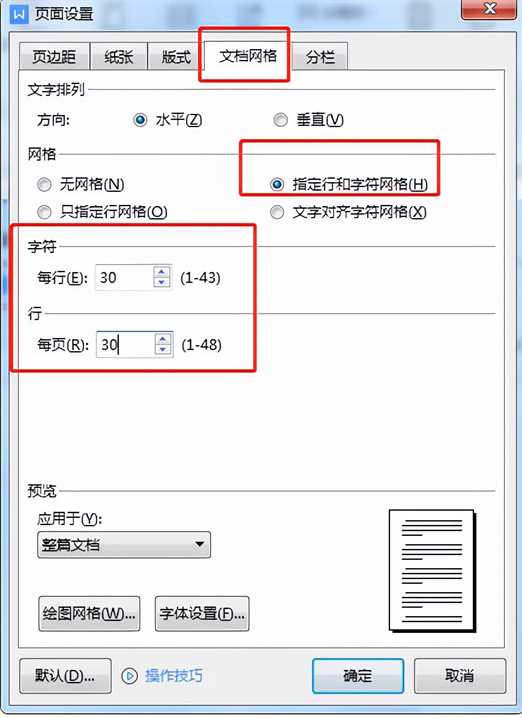 2、在弹出的【页面设置】对话框中,将选项卡切换到【文档网络】,在网络中选择【指定行和字符网络】,在字符组的每行和行组的每页中修改每行字符数和每页行数,修改合适的数字完成后点击确定键即可完成!