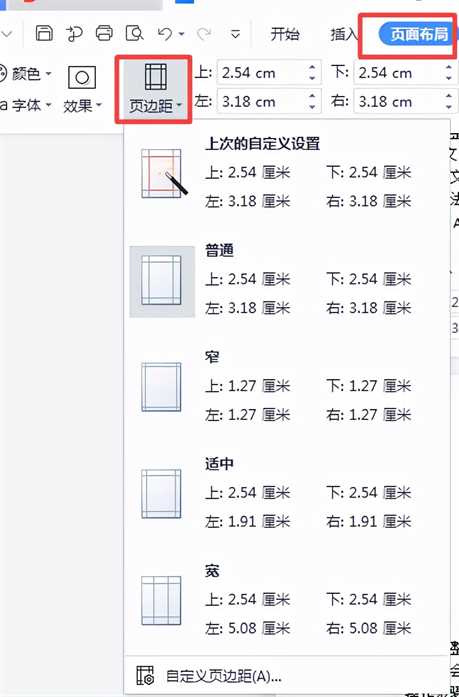 操作步骤:在【页面布局】选项卡的功能区选择【页边距】,在弹出的选项中选择需要的页边距。