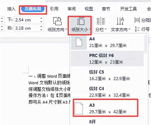 操作方法:在【页面布局】选项卡的功能区选择【纸张大小】,在弹出的选项中选择【A3】,即可从A4尺寸到A3尺寸的修改。