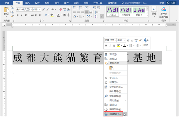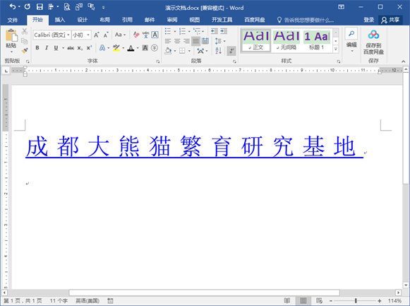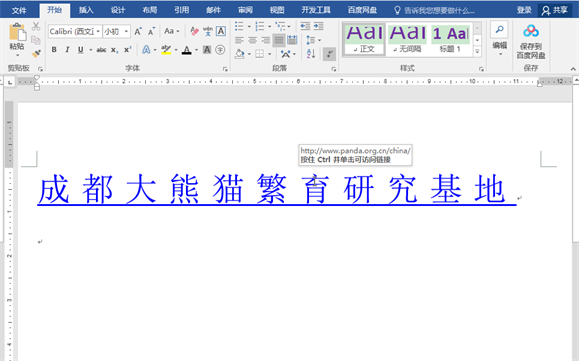 4.返回文档,可以看到文本“成都大熊猫繁育研究基地”已经变为蓝色,并且下方有一条横线,表示超链接已经添加成功。接下来我们按住ctrl键单击文本,就能快速跳转到“成都大熊猫繁育研究基地”的网站了。