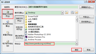 3.在打开的“插入超链接”对话框中,选择左侧列表中的“现有文件或网页”,在下方的“地址”编辑栏中输入“成都大熊猫繁育研究基地”的网址,最后单击“确定”按钮。