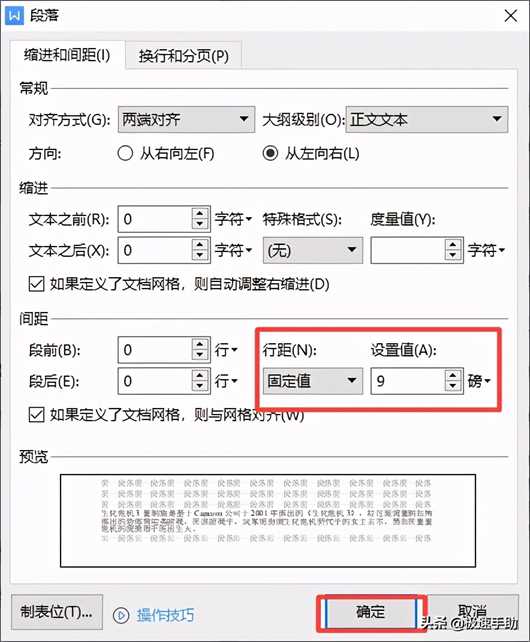 接着软件就会弹出【段落】的设置窗口,在此界面中,我们将【行距】调整为【固定值】,接着将【设置值】调整为【9】,然后点击【确定】按钮。
