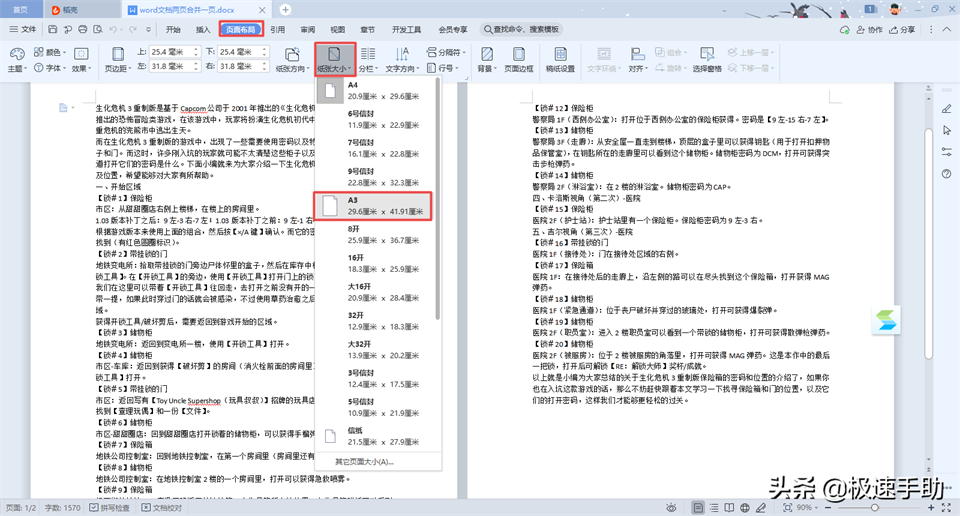 第三步,然后我们找到软件工具栏上的【页面布局】选项卡,并点击进入,接着在其下方的选择中选择【纸张大小】选项,并点击它,然后再其弹出的选项中选择【A3】纸张。