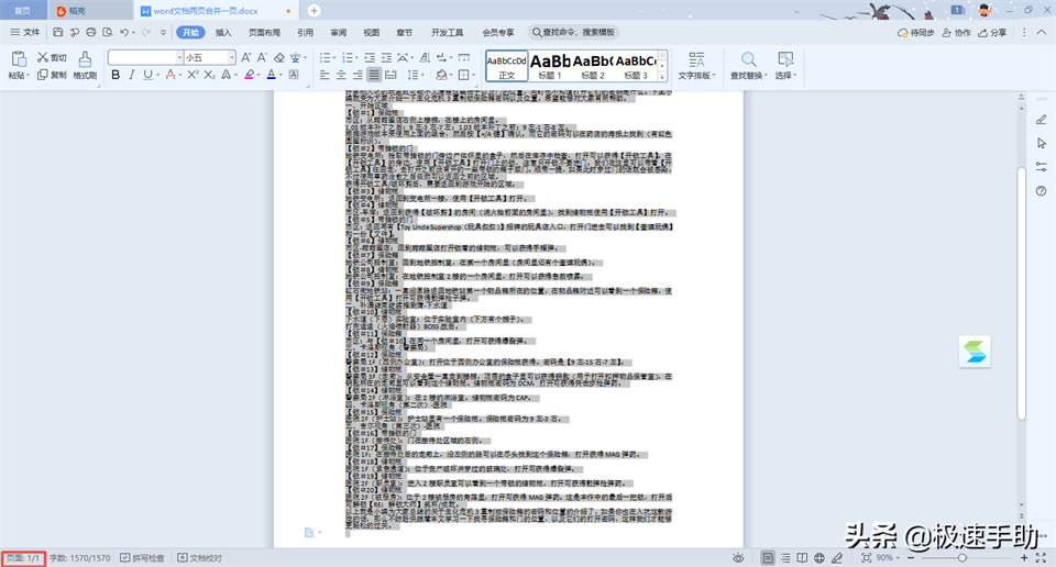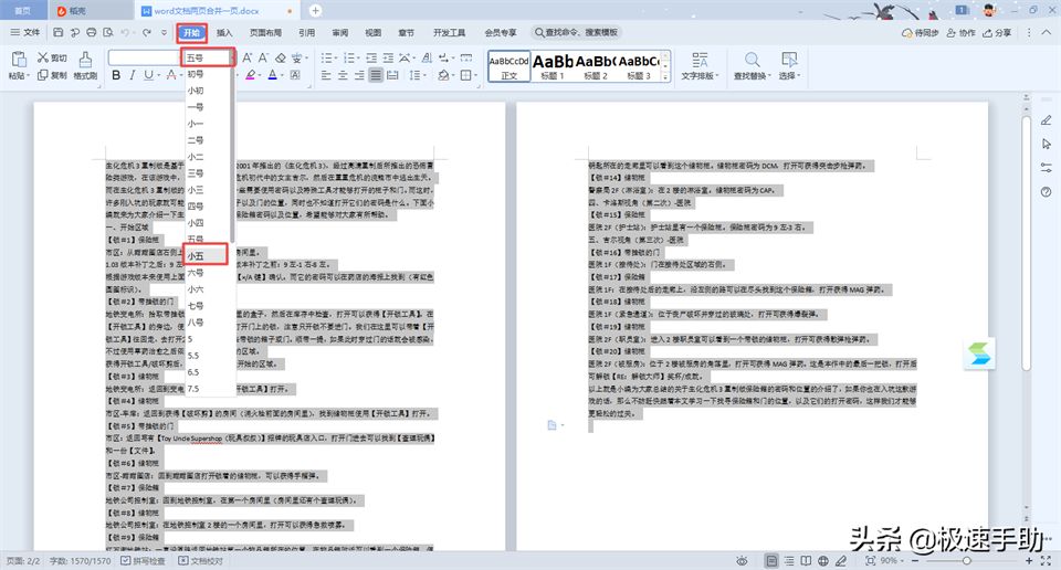 除了调整纸张的大小,我们还可以通过调整文档中文字的字体大小,来将两页合并成一页。选中文档中的所有文字,然后在【开始】选项卡中,找到文字的字号,接着将原本的【五号】字号修改为【小五】。