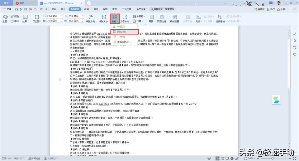 第五步,如果最后获得的一页内容觉得版面不好看的话,那么我们可以选择【页面布局】选项卡下方的【分栏】功能,接着选择【两栏】选项。