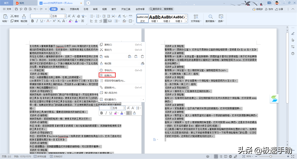 除了上述的两种方法,我们还可以通过调整文档字体的行间距,来将两页合并成一页。选中文档中的所有文字,然后按下鼠标右键,在弹出的选项中,选择【段落】选项。
