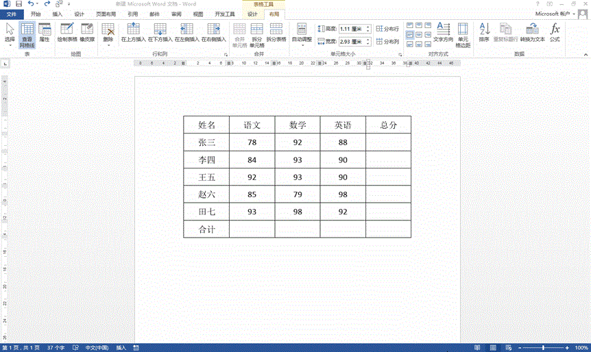 请看下面的表格,我们需要在每个人员的右侧汇总各科成绩。在Word中不能像Excel中那么方便直接手动数据求和公式,在这里需要在表格工具的布局选项中点击最右侧的公式这时会自动帮我们填充公式=SUM(LEFT),直接确定即可,需要注意的是,如果我们想一次性将这一列的数据求和都做出来,全部选中插入求和公式是不行的,结果只会插入第一个单元格,我们需要将第一个单元格的内容复制一下,粘贴到下面的几个单元格,然后按一下F9就可以实现数据跟新,完成求和。