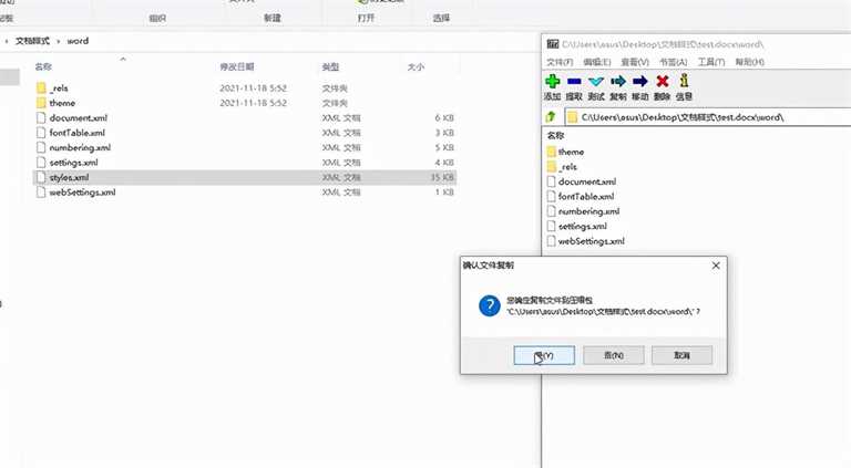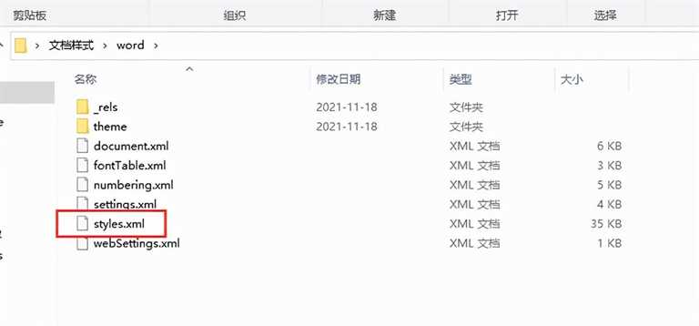步骤三、删除原文档中的word文件夹下的styles.xml,把新文档的styles.xml移动进去原文档压缩包的word文件夹中