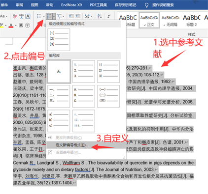 1.鼠标选中文末的参考文献,点击段落中的编号,进行自定义