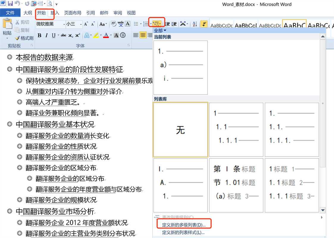 然后在光标定位到任意标题前面,选择开始->段落->多级列表->定义新的多级列表,如图所示: