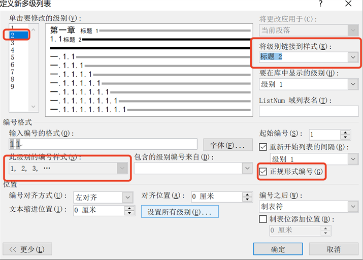 接着选择要修改级别2,将级别编号设置成1、2、3这种形式,同时将级别样式链接到标题2,这里特别注意一定要将右边的起始编号勾选上(这步是设置混合标题编号的关键),如图所示: