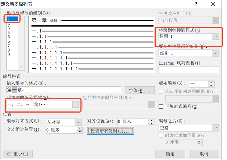 选择修改级别1,并在编号样式选择一、二、三这种形式,同时将级别链接到标题1上,如下图所示: