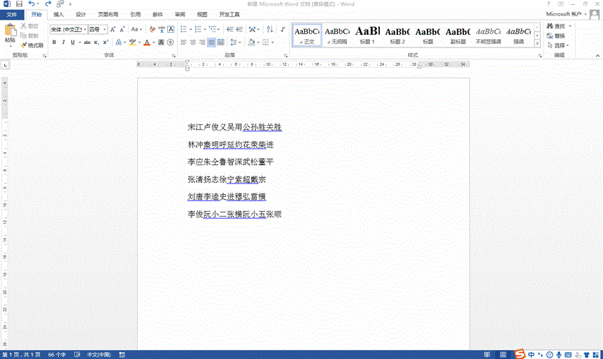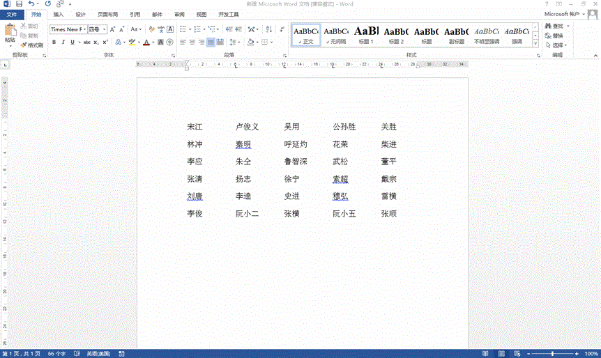 首先观察一下,要求一行排列五个名字,可以按照六个字符为间距进行排布。选中所有名单,在段落设置中打开制表位对话框,设置4个制表位,全部按照左对齐,无需前导符,然后使用Tab键将每一个名字跳转到指定位置,这一步比较简单。