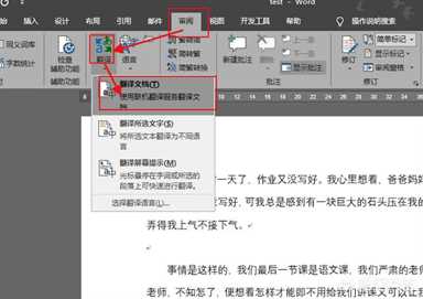 我们将工具栏切换到审阅,然后点击翻译,在弹出的下拉菜单里选择翻译文档。