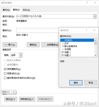 1、“[一二三四五六七八九十]”表示查找含有“一、”“二、”等的段落,将其设置为标题6样式。