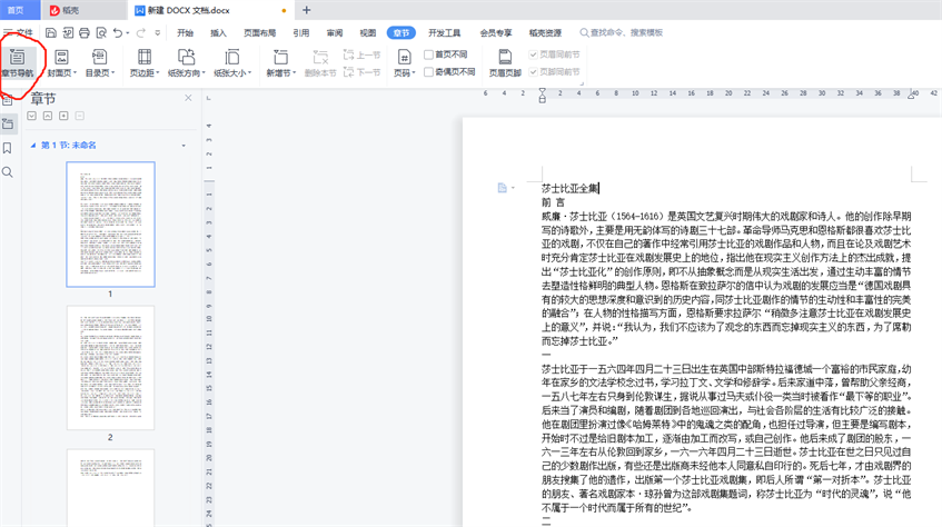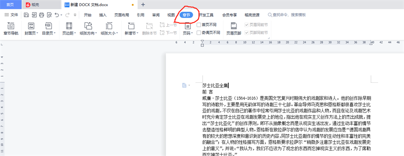 1、找到文件中的“章节”工具,打开一个word文件,在工具栏上方,有一个章节的工具(已经画红圈了)