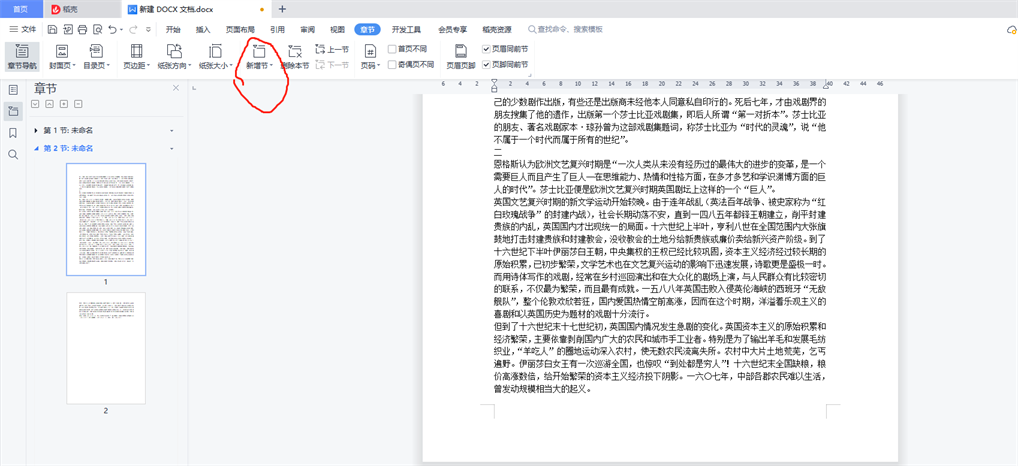 3、我们现在想改变的是第二页的方向,所以用鼠标点中第一页文章末尾,然后找到新增节的工具,看下图,最后左侧的导航栏里就会把第二页变成新的章节了。