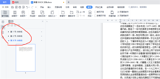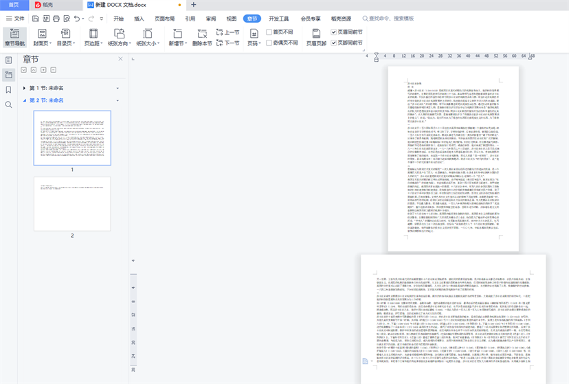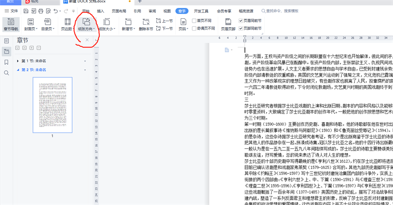 5、最终我们点开导航里的“第2节:未命名”,点开工具栏里的纸张方向,然后选择横向,这样大家就可以看到文章里有横向也有纵向的章节了。