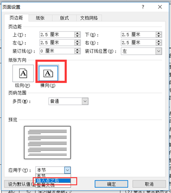 在弹出的对话框中选择“横向”,应用于“插入点之后”。