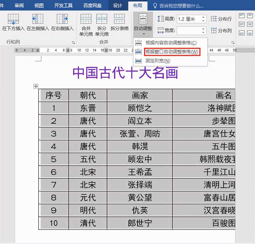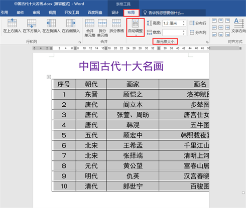 2.在“表格工具”“布局”选项卡下的“单元格大小”功能组中单击“自动调整”按钮。