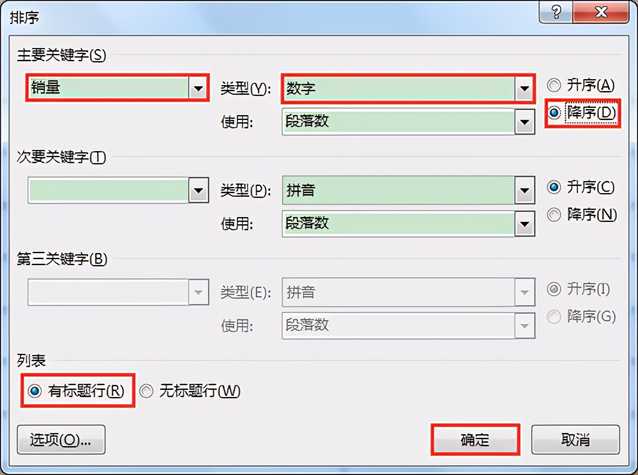 3.在打开的“排序”对话框中,选择“主要关键字”为“销量”,“类型”为“数字”,按“降序”排序,同时勾选“列表”下的“有标题行”选项,最后单击对话框右下角的“确定”按钮。
