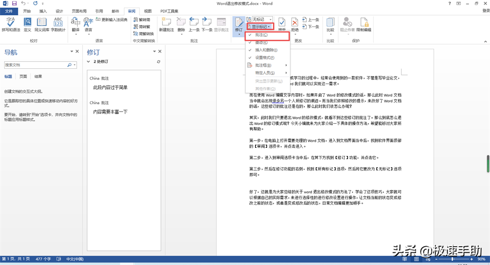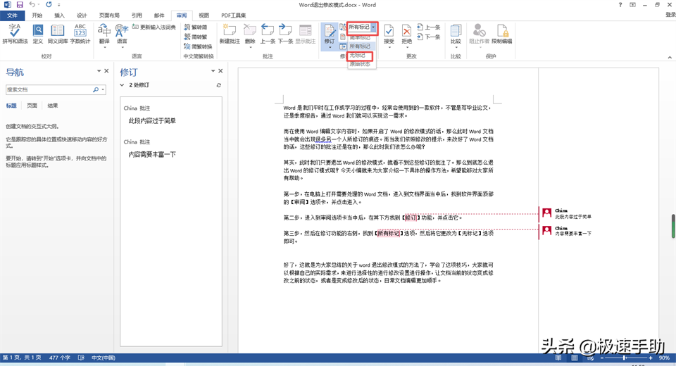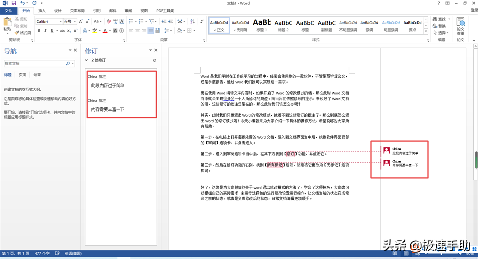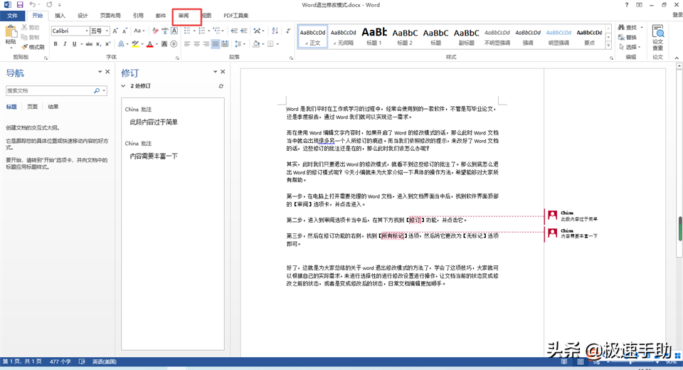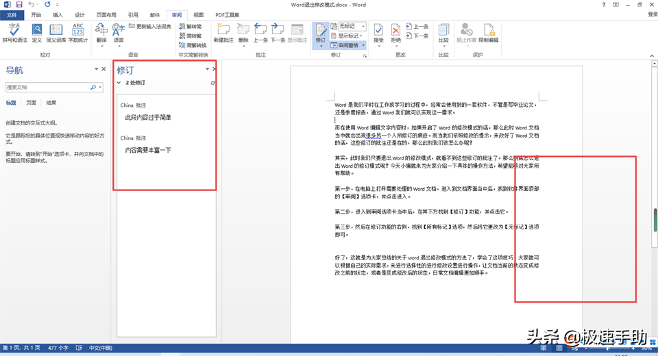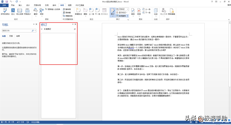 第六步,最后回到word文档界面后,在审阅窗格的修订中也没有了批注的标记,文档界面变得很干净了。