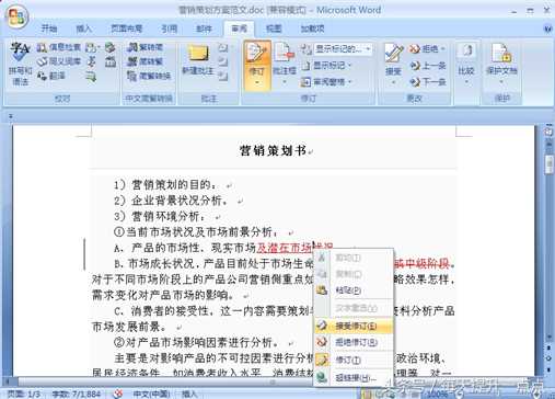 当Word文档返回来时,可以选中更改的部分,右键快捷菜单可以选择“接受”或是“拒绝”修订,接受就是保留更改,拒绝就是维持原状。
