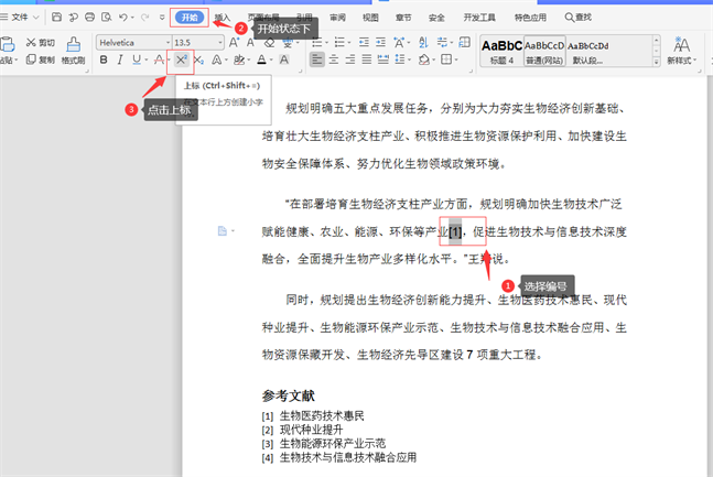 3、选择刚才的插入编号,然后“开始”-点击上标,这样就设置好了,如果想查看参考文献就可以Ctrl键点击编号就可以了