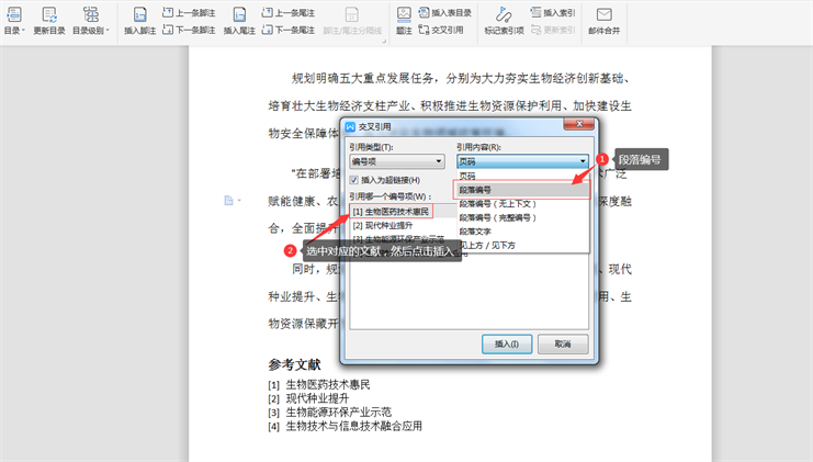 2、在弹出的交叉引用对话框里,引用内容选择“段落编号”,引用哪一个编号项栏目现在对应的文献,然后点击插入