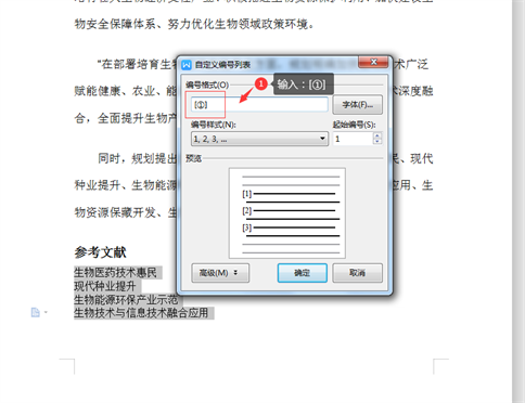 3、在自定义编号列表对话框里,编号格式改成[①],然后确认,这样文献编号就编辑好了