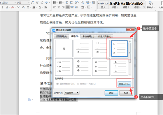 2、在弹出的“项目符号和编号”对话框里选择第三个,然后点击“自定义”