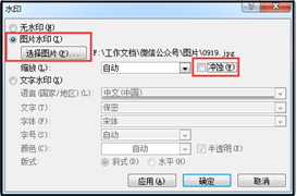 2、在弹出的【水印】对话框里,选择【图片水印】—【选择图片】,插入要设置为背景的图片,并取消【冲蚀】的勾选。