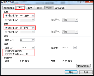 2、在弹出的【设置图片格式】对话框里,选择【大小】,对图片大小进行设置,即: