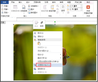 1、鼠标双击上面页眉处,进入页眉编辑状态,然后鼠标右击插入的图片—【设置图片格式】;