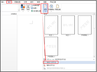 1、点击菜单的【设计】—【水印】—【自定义水印】;