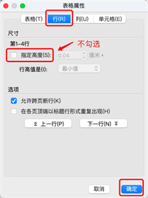 3、在弹出的窗口中,切换到【行】选项卡,取消勾选“指定高度”前的复选框;
