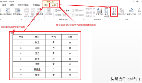 最佳答案要对表格数据进行排序,第一步:当然是要选中要排序的表格,这个我们可以点击表格左上角的“十字箭头”,也可以随便点击表格中的任意一个单元格;第二步:点击工具栏上“新”出现的【表格工具】选项卡下的【布局】......