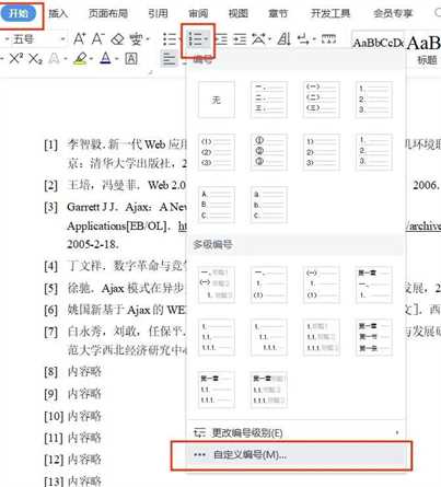 ✿ 步骤一:选中需要添加序号的参考文献内容,点击开始栏中的编号选项,接着点击自定义编号