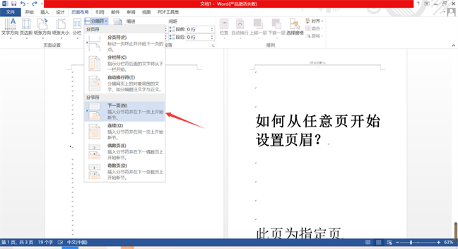 ✿ 点击分隔符,选择分分节符的下一页,插入分节符。