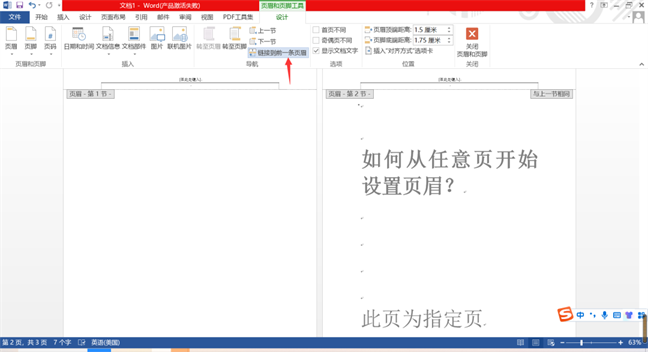 ✿ 把鼠标光标设在指定页的页眉处,点击取消链接到前一条页眉的设置。