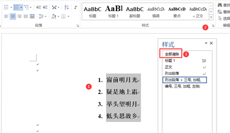 ✿ ①选中要去除自动编号的文字,②点击[样式],调出样式设置框,③点击“全部清除”。