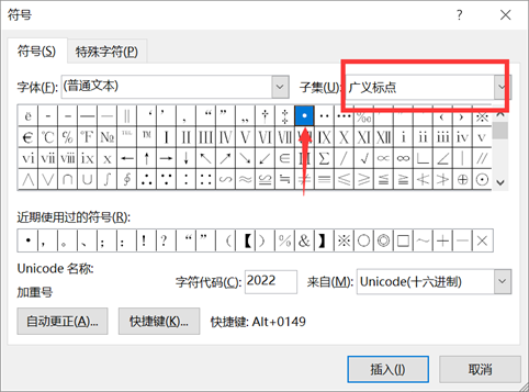 ✿ 在【子集】中选择【广义标点】即可找到小圆点。