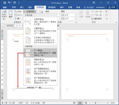 在第一个文件的最后(即要插入第 2 的文件的位置),选取「版面配置/分隔符」,再选取「分节符/下一页」。(用以在新的一页开始新的一节)