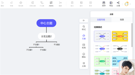 3、进入绘图界面后,从【中心主题】出发,可添加主题或子主题,编辑主题内容,修改文字颜色,边框形状,线条颜色,还可以添加概要,关联线,用图标来标记重点等,知道完善思维导图;