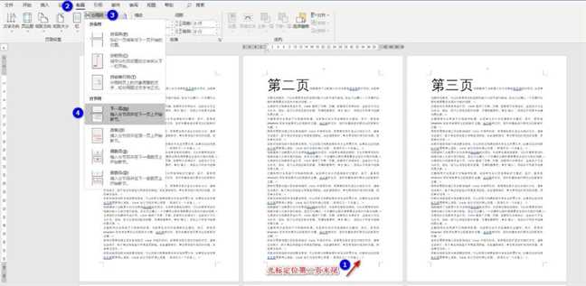 光标定位到第二页末尾,在功能区点击布局选显卡里面分隔符,选择插入下一页分节符;